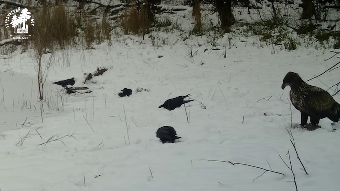 В объектив фотоловушки попали эксклюзивные кадры — мирная трапеза краснокнижного орлана-белохвоста совместно с воронами в Бузулукском бору.