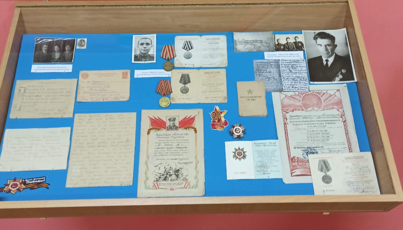 В экспозиции представлены документы, фотографии до- и послевоенного времени, письма родным с фронта и из госпиталей, наградные листы, благодарственные грамоты, награды, удостоверения к наградам. А ещё комсомольские билеты, красноармейские книжки, амуниция, обмундирование, книги, фотоаппарат, губная гармоника, предметы личной гигиены…