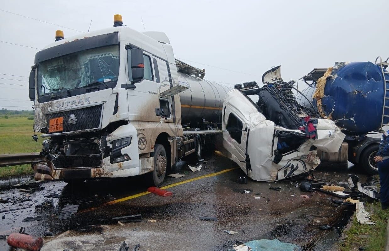 Водитель автомобиля «Скания» с полуприцепом-цистерной не выдержал безопасную дистанцию и столкнулся с автомобилем «Ситрак» в сцепке с полуприцепом-цистерной. Тот ехал в попутном направлении и остановился на запрещающий сигнал светофора. После этого второй грузовик отбросило на впереди стоящий «КамАЗ» в сцепке с полуприцепом-цистерной. В результате нефть вылилась на дорогу.